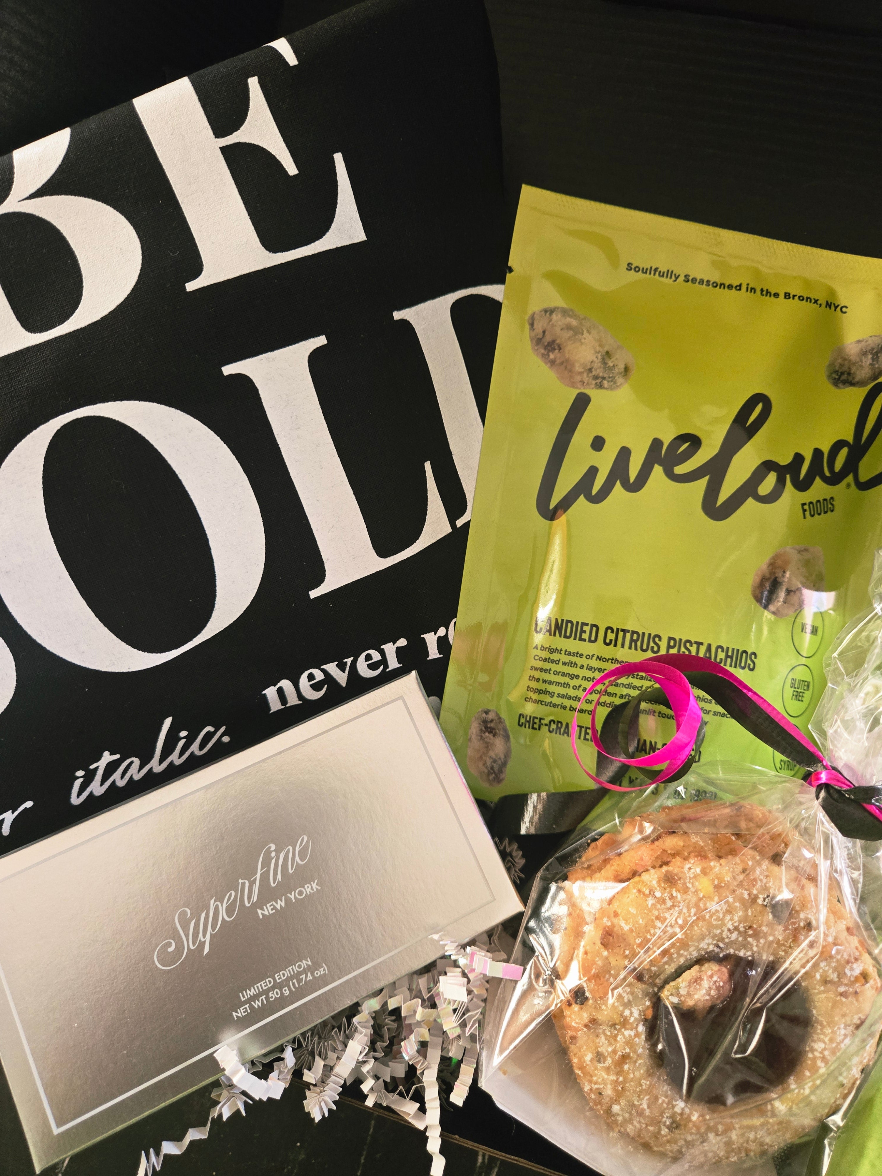 The Bold & Cozy Holiday Collection is a limited-edition gift set crafted by three women founders who believe flavor should be bold and comfort should be intentional. Inside each box you’ll find our signature Be Bold tote, Pistachio Guavaberry Cookies made with our candied pistachios, a handcrafted gingerbread-filled chocolate bar, and your choice of Live Loud Nuts. Small-batch, beautifully curated, and designed for meaningful holiday gifting.
