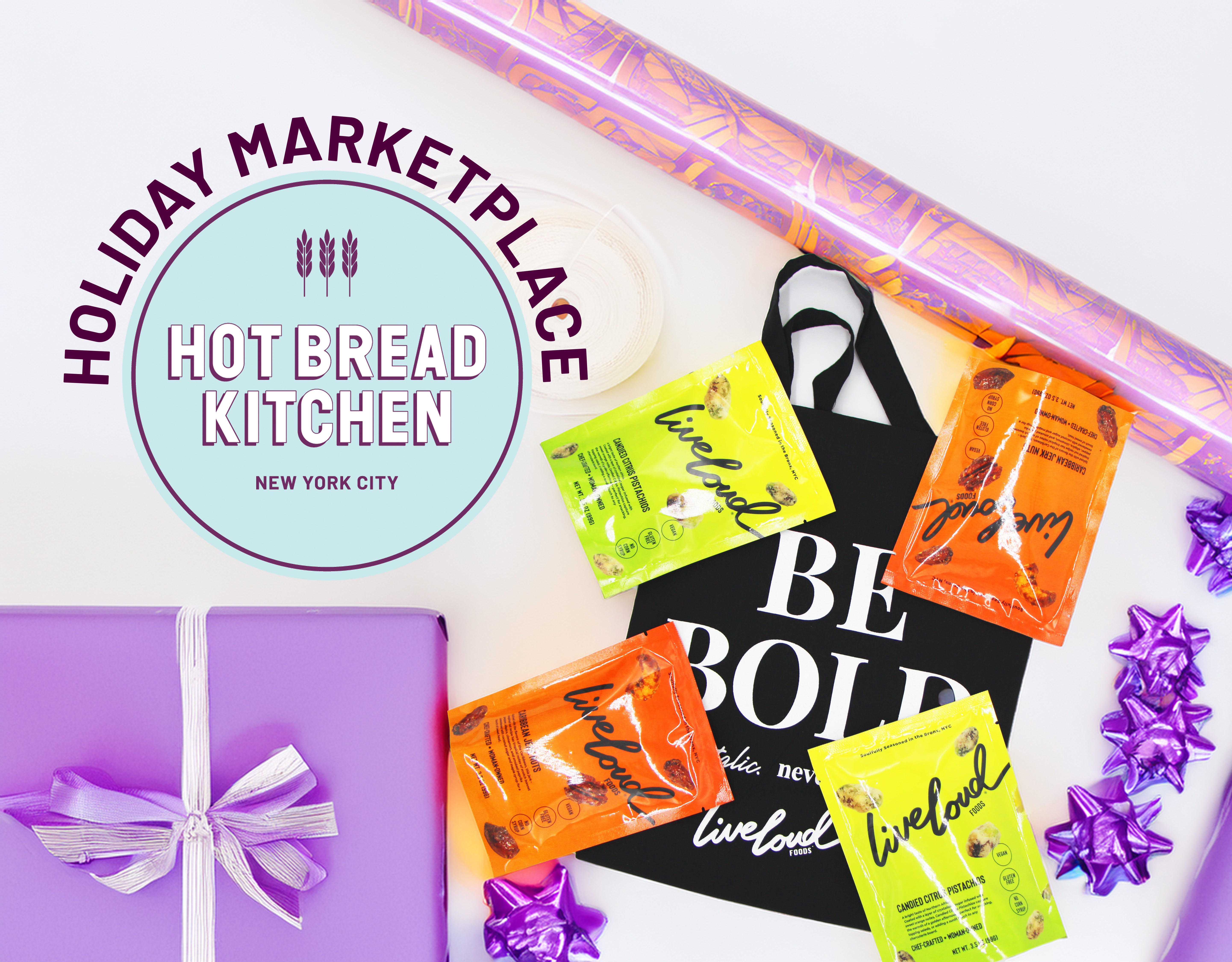 We’re thrilled to partner with Hot Bread Kitchen for their Holiday Marketplace, a celebration of local entrepreneurs and their unique creations. Together, we’re sharing Live Loud Foods’ Holiday Snack Box, a limited-edition collection of bold, crave-worthy nuts and an exclusive tote — available November 10th through December 19th. Each piece reflects the flavor, creativity, and joy that define Live Loud Foods.